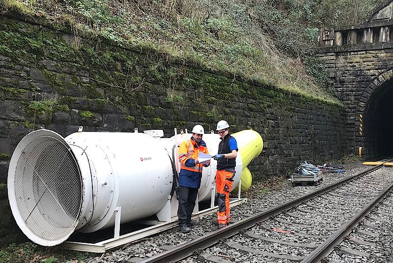 Im Hoffnungsthaler Tunnel werden Gleise und Gleisschotter vollständig erneuert. Die Arbeiten sind mit intensiver Staubentwicklung und einer Belastung der Arbeitsatmosphäre durch Gefahrstoffe aus Dieselmotoren wie Kohlenmonoxid oder Stickoxide verbunden. Damit trotz dieser widrigen Bedingungen sicher im Tunnel gearbeitet werden kann, wurde DMT von KAF Falkenhahn Bau AG beauftragt, für sichere Arbeitsbedingungen durch Zufuhr von Frischluft und Überwachung der Schadstoffkonzentrationen zu sorgen.